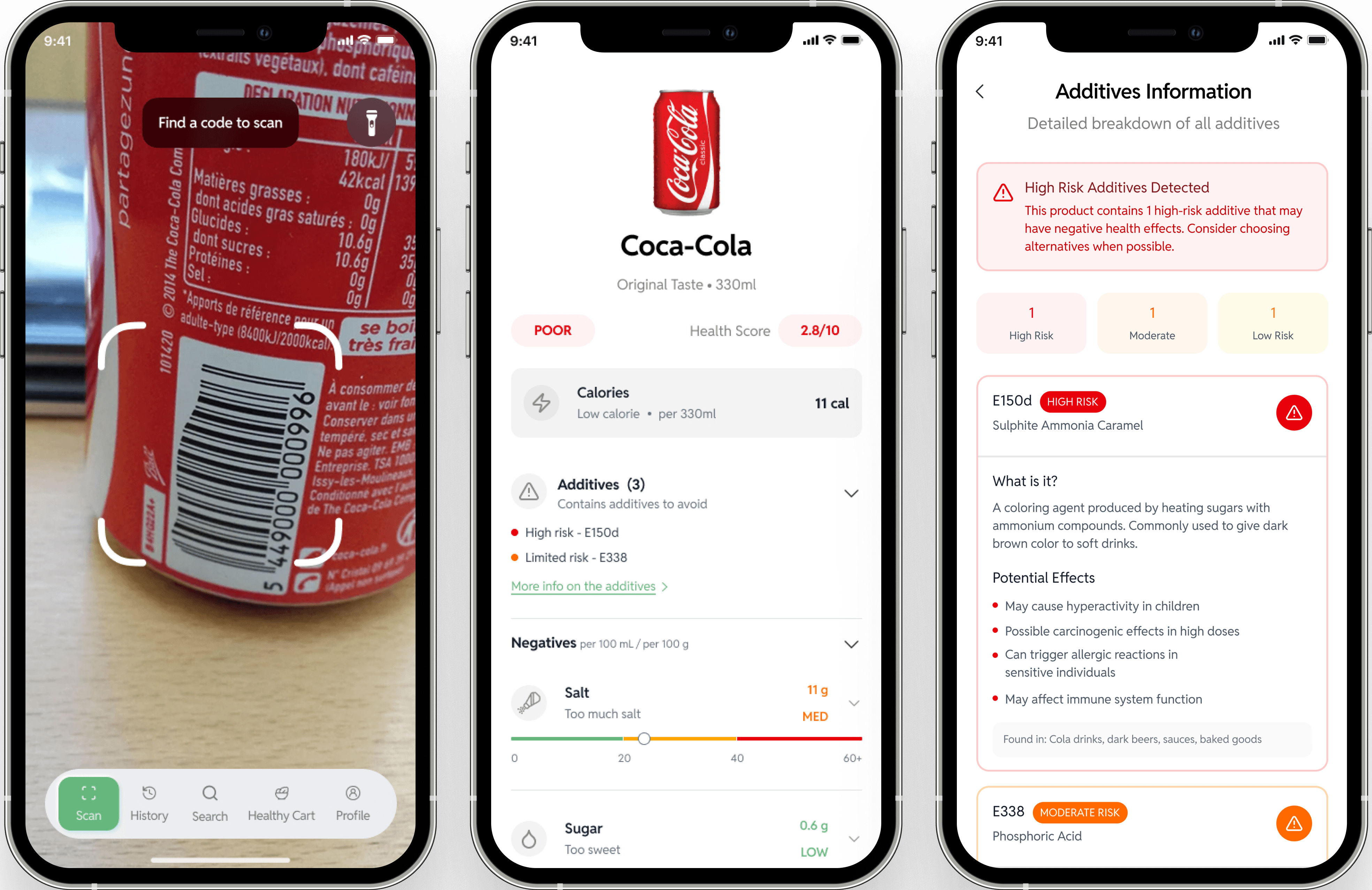 Scan a product barcode to receive a health score out of 10, calculated using a UK-based nutrition algorithm (10 = healthiest, 0 = least healthy).